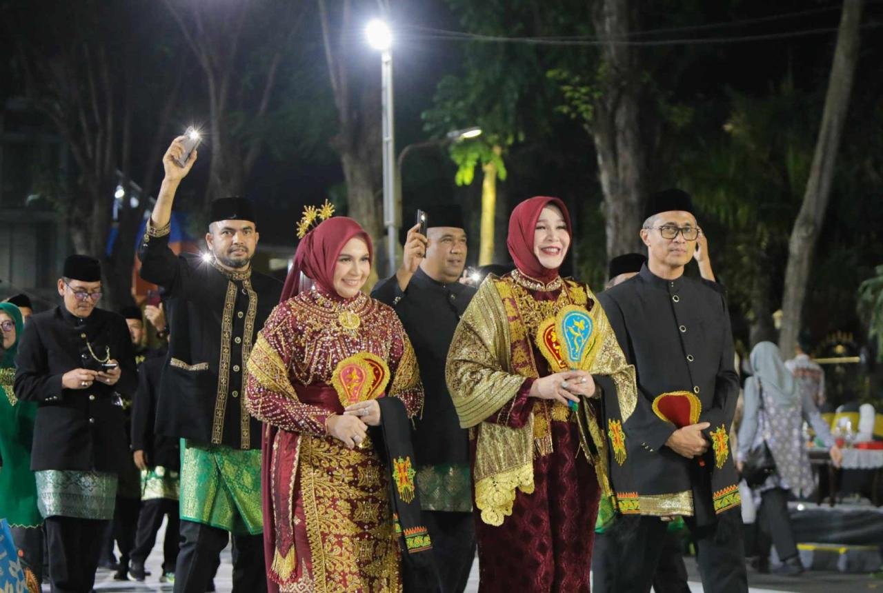 Wali Kota Banda Aceh, Illiza Sa’aduddin Djamal, tampil anggun dalam balutan busana adat, didampingi suaminya Amir Ridha, yang juga Ketua Dekranasda serta Ketua TP PKK Kota Banda Aceh, Dessy Maulida. Ketiganya menyapa hangat warga ‘Kota Pahlawan’, menciptakan suasana penuh keakraban dan kegembiraan.