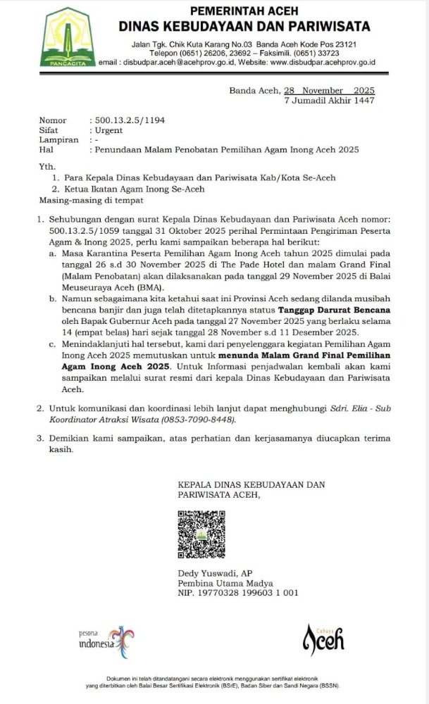 “Menindaklanjuti hal tersebut, kami dari penyelenggara kegiatan Pemilihan Agam Inong Aceh 2025 memutuskan untuk menunda Malam Grand Final Pemilihan Agam Inong Aceh 2025. Untuk informasi penjadwalan kembali akan kami sampaikan melalui surat resmi dari kepala Dinas Kebudayaan dan Pariwisata Aceh,” kata Dedy, Jumat 28 November 2025.